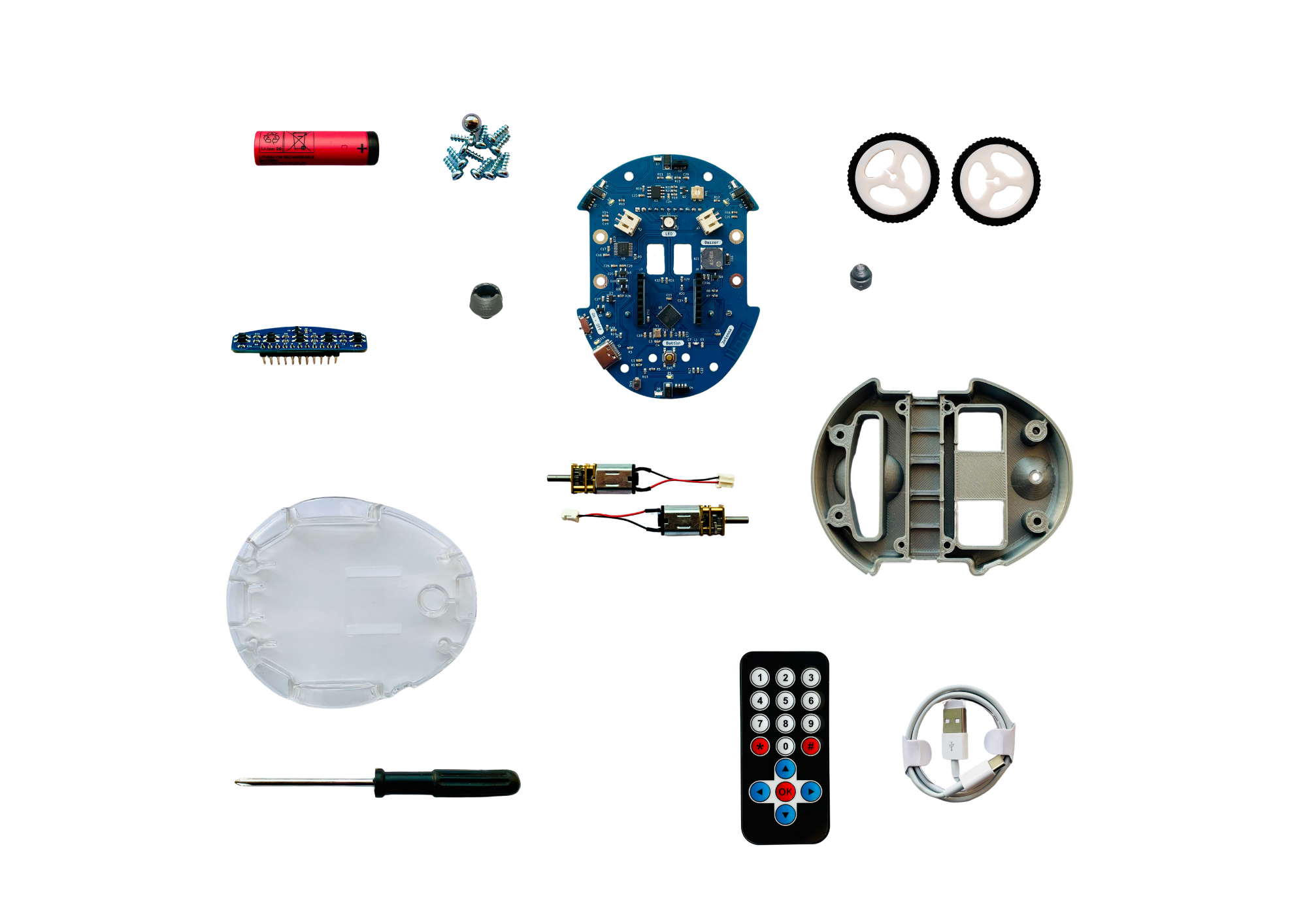 Y compris une télécommande, le câble pour recharger et programmer ton robot, ainsi que le tournevis qui est le seul outil nécessaire au montage !